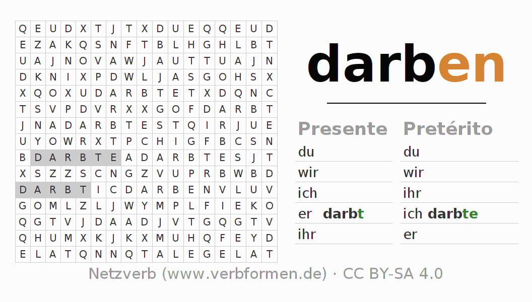 Con el juego de palabras cruzadas (Wortsuchrätsel o Suchsel) puedes aprender las conjugaciones alemanas. Tienes que armar cada una de las formas verbales para después encontrarlas dentro de una sopa de letras. También puedes proceder de forma contraria. Una vez que encuentras un verbo conjugado, tienes que descubrir a qué forma verbal pertenece. Para descargar e imprimir, puedes acceder por aquí a una versión en PDF-Versión o también como imagen. También hay muchas otras hojas de ejercicios para los verbos darben. Todo el material de estudio es Open Educational Resources (OER), es decir, libre de licencias CC BY-SA 4.0 y puede ser descargado y utilizado de forma gratuita. En este link en la sección de ayuda encuentras más información Poner en práctica las sopas de letras en el aula y el autoaprendizaje..