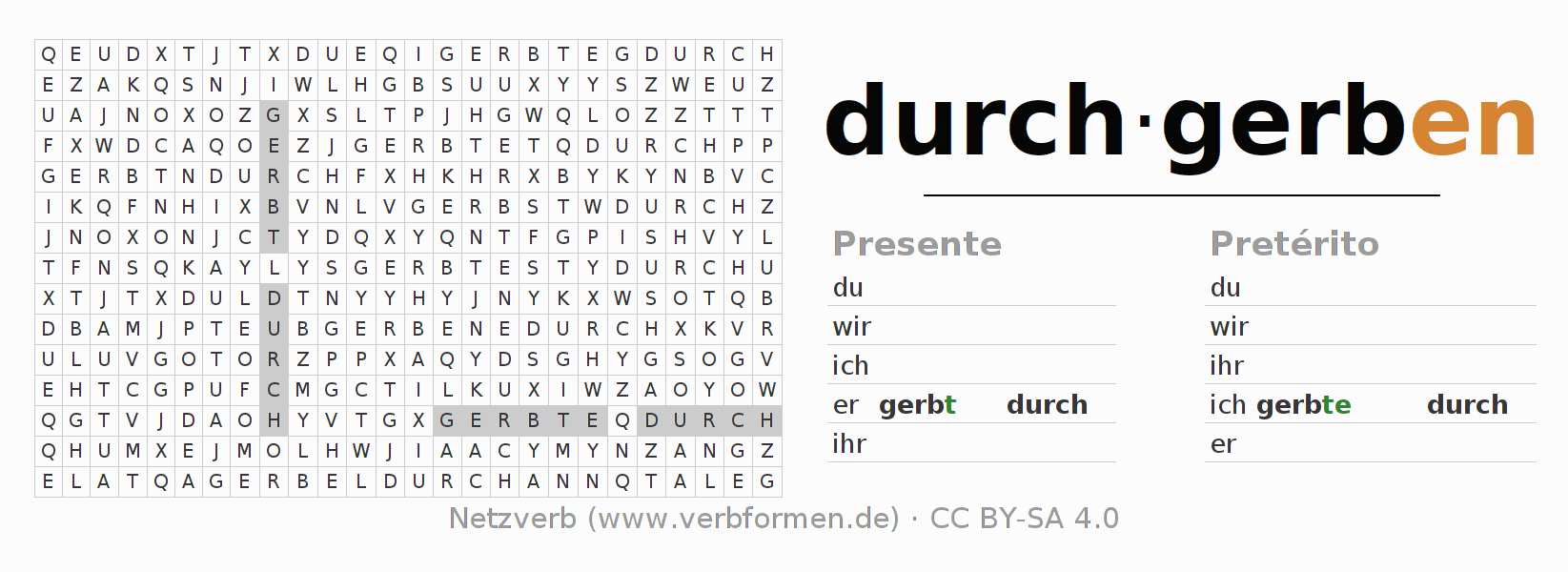 Guía: forma las construcciones correctas para el verbo durchgerben y encuéntralas en el acertijo. O también encuentra la conjugación de durchgerben en la sopa de letras y ordénala en la construcción verbal correcta. Las diéresis y el ß aparecen escritos como: ss (ß), oe (ö), ae (ä) y ue (ü).La solución se encuentra al final de la página.