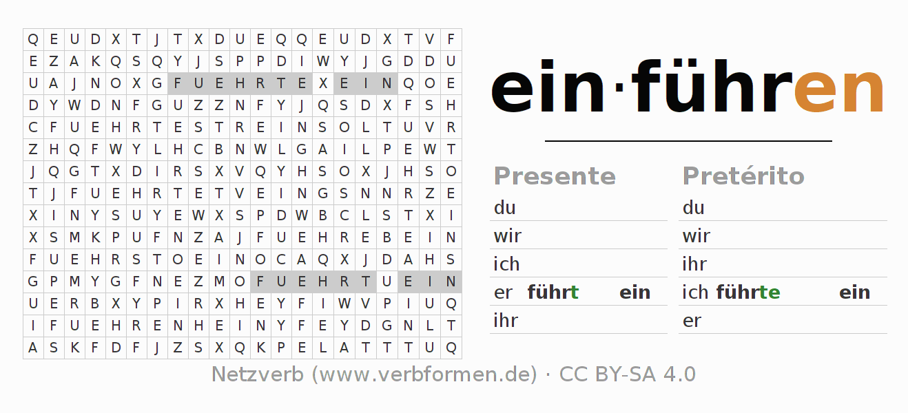 Guía: forma las construcciones correctas para el verbo einführen y encuéntralas en el acertijo. O también encuentra la conjugación de einführen en la sopa de letras y ordénala en la construcción verbal correcta. Las diéresis y el ß aparecen escritos como: ss (ß), oe (ö), ae (ä) y ue (ü).La solución se encuentra al final de la página.