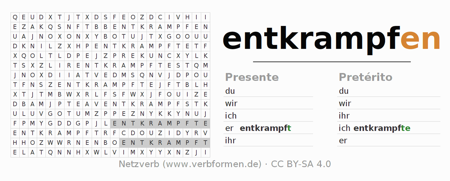 Guía: forma las construcciones correctas para el verbo entkrampfen y encuéntralas en el acertijo. O también encuentra la conjugación de entkrampfen en la sopa de letras y ordénala en la construcción verbal correcta. Las diéresis y el ß aparecen escritos como: ss (ß), oe (ö), ae (ä) y ue (ü).La solución se encuentra al final de la página.