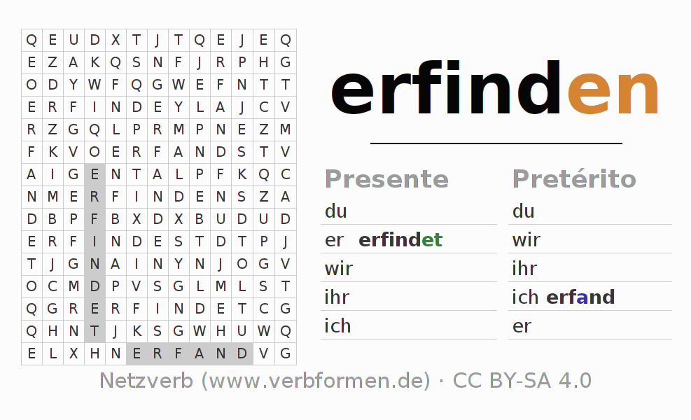 Con el juego de palabras cruzadas (Wortsuchrätsel o Suchsel) puedes aprender las conjugaciones alemanas. Tienes que armar cada una de las formas verbales para después encontrarlas dentro de una sopa de letras. También puedes proceder de forma contraria. Una vez que encuentras un verbo conjugado, tienes que descubrir a qué forma verbal pertenece. Para descargar e imprimir, puedes acceder por aquí a una versión en PDF-Versión o también como imagen. También hay muchas otras hojas de ejercicios para los verbos erfinden. Todo el material de estudio es Open Educational Resources (OER), es decir, libre de licencias CC BY-SA 4.0 y puede ser descargado y utilizado de forma gratuita. En este link en la sección de ayuda encuentras más información Poner en práctica las sopas de letras en el aula y el autoaprendizaje..