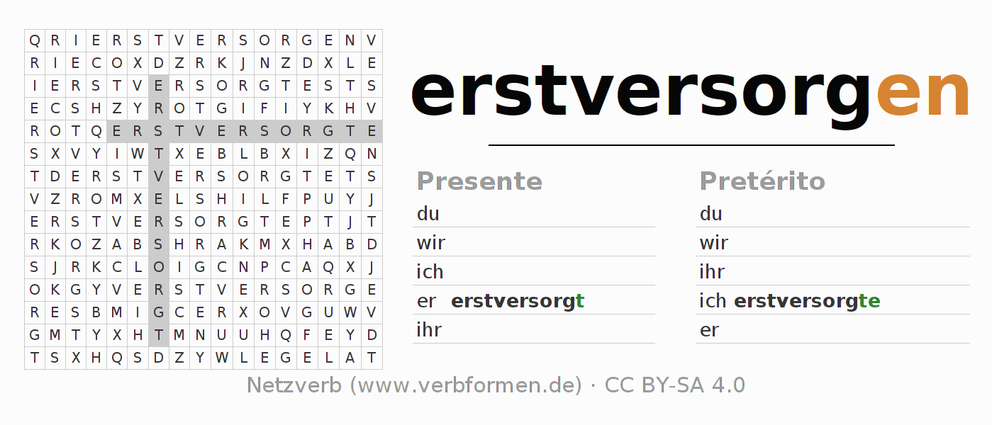Guía: forma las construcciones correctas para el verbo erstversorgen y encuéntralas en el acertijo. O también encuentra la conjugación de erstversorgen en la sopa de letras y ordénala en la construcción verbal correcta. Las diéresis y el ß aparecen escritos como: ss (ß), oe (ö), ae (ä) y ue (ü).La solución se encuentra al final de la página.