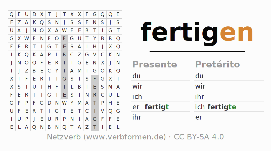 Guía: forma las construcciones correctas para el verbo fertigen y encuéntralas en el acertijo. O también encuentra la conjugación de fertigen en la sopa de letras y ordénala en la construcción verbal correcta. Las diéresis y el ß aparecen escritos como: ss (ß), oe (ö), ae (ä) y ue (ü).La solución se encuentra al final de la página.