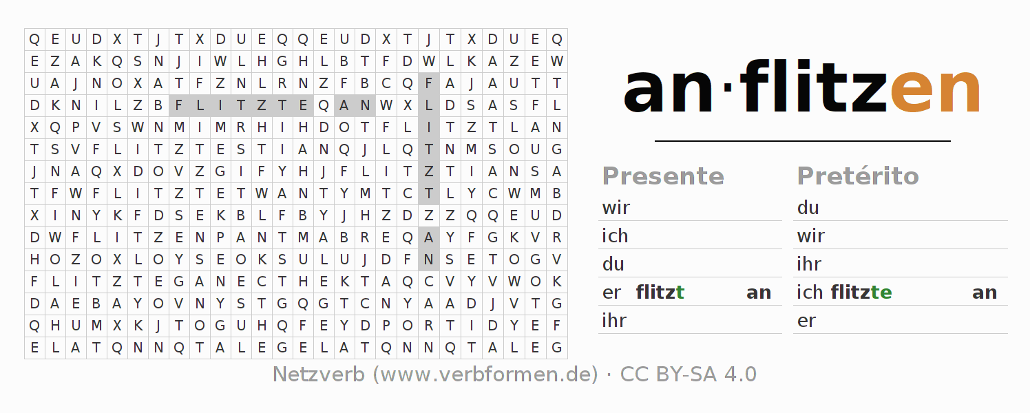 Guía: forma las construcciones correctas para el verbo anflitzen y encuéntralas en el acertijo. O también encuentra la conjugación de anflitzen en la sopa de letras y ordénala en la construcción verbal correcta. Las diéresis y el ß aparecen escritos como: ss (ß), oe (ö), ae (ä) y ue (ü).La solución se encuentra al final de la página.