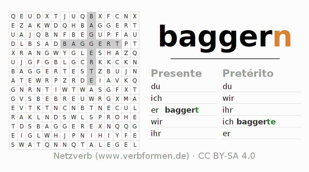 Con el juego de palabras cruzadas (Wortsuchrätsel o Suchsel) puedes aprender las conjugaciones alemanas. Tienes que armar cada una de las formas verbales para después encontrarlas dentro de una sopa de letras. También puedes proceder de forma contraria. Una vez que encuentras un verbo conjugado, tienes que descubrir a qué forma verbal pertenece. Para descargar e imprimir, puedes acceder por aquí a una versión en PDF-Versión o también como imagen. También hay muchas otras hojas de ejercicios para los verbos baggern. Todo el material de estudio es Open Educational Resources (OER), es decir, libre de licencias CC BY-SA 4.0 y puede ser descargado y utilizado de forma gratuita. En este link en la sección de ayuda encuentras más información Poner en práctica las sopas de letras en el aula y el autoaprendizaje..