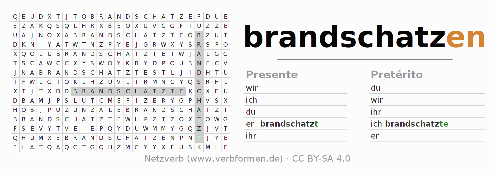 Con el juego de palabras cruzadas (Wortsuchrätsel o Suchsel) puedes aprender las conjugaciones alemanas. Tienes que armar cada una de las formas verbales para después encontrarlas dentro de una sopa de letras. También puedes proceder de forma contraria. Una vez que encuentras un verbo conjugado, tienes que descubrir a qué forma verbal pertenece. Para descargar e imprimir, puedes acceder por aquí a una versión en PDF-Versión o también como imagen. También hay muchas otras hojas de ejercicios para los verbos brandschatzen. Todo el material de estudio es Open Educational Resources (OER), es decir, libre de licencias CC BY-SA 4.0 y puede ser descargado y utilizado de forma gratuita. En este link en la sección de ayuda encuentras más información Poner en práctica las sopas de letras en el aula y el autoaprendizaje..