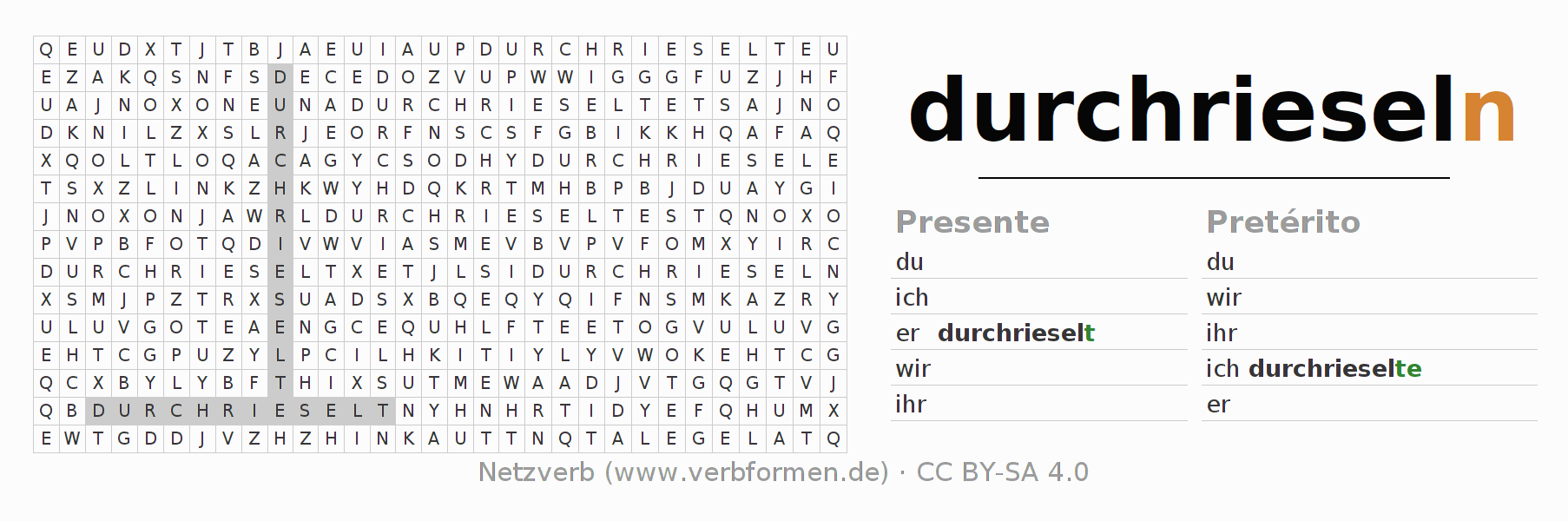 Guía: forma las construcciones correctas para el verbo durchrieseln y encuéntralas en el acertijo. O también encuentra la conjugación de durchrieseln en la sopa de letras y ordénala en la construcción verbal correcta. Las diéresis y el ß aparecen escritos como: ss (ß), oe (ö), ae (ä) y ue (ü).La solución se encuentra al final de la página.