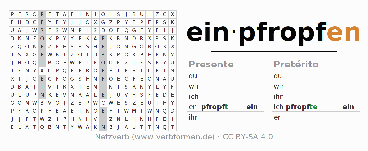 Guía: forma las construcciones correctas para el verbo einpfropfen y encuéntralas en el acertijo. O también encuentra la conjugación de einpfropfen en la sopa de letras y ordénala en la construcción verbal correcta. Las diéresis y el ß aparecen escritos como: ss (ß), oe (ö), ae (ä) y ue (ü).La solución se encuentra al final de la página.