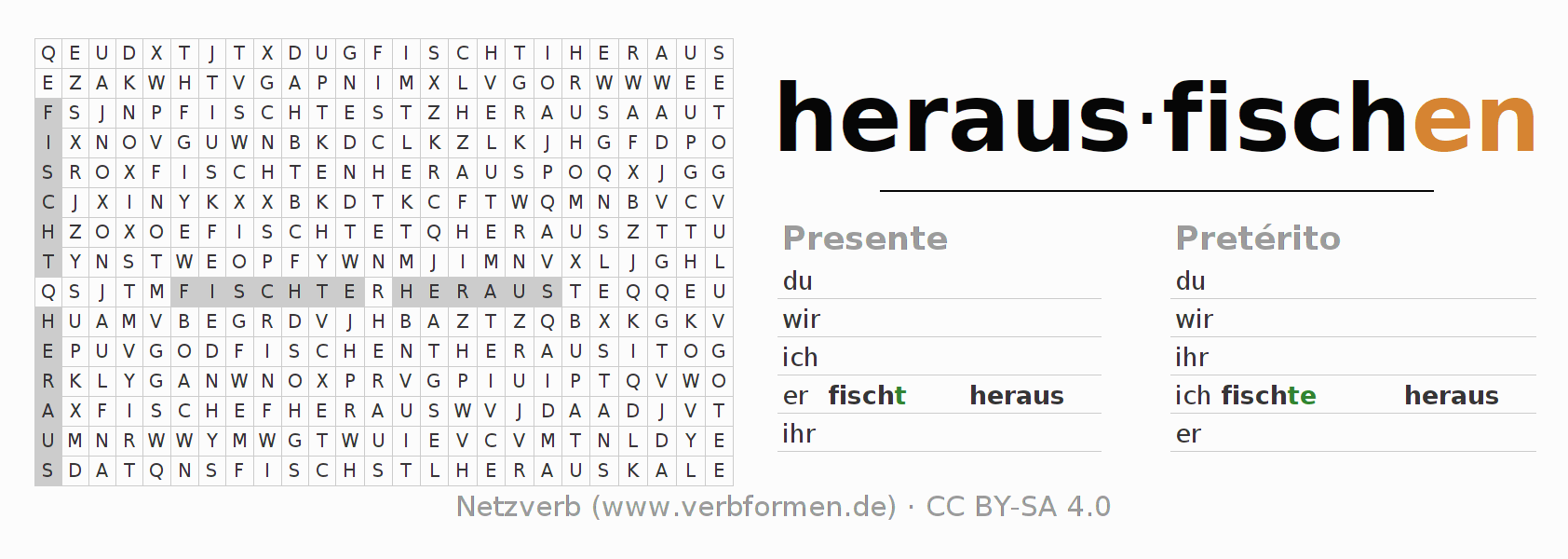 Guía: forma las construcciones correctas para el verbo herausfischen y encuéntralas en el acertijo. O también encuentra la conjugación de herausfischen en la sopa de letras y ordénala en la construcción verbal correcta. Las diéresis y el ß aparecen escritos como: ss (ß), oe (ö), ae (ä) y ue (ü).La solución se encuentra al final de la página.