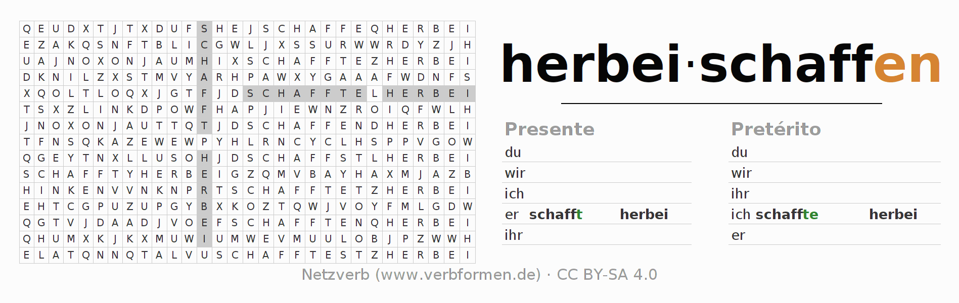 Con el juego de palabras cruzadas (Wortsuchrätsel o Suchsel) puedes aprender las conjugaciones alemanas. Tienes que armar cada una de las formas verbales para después encontrarlas dentro de una sopa de letras. También puedes proceder de forma contraria. Una vez que encuentras un verbo conjugado, tienes que descubrir a qué forma verbal pertenece. Para descargar e imprimir, puedes acceder por aquí a una versión en PDF-Versión o también como imagen. También hay muchas otras hojas de ejercicios para los verbos herbeischaffen. Todo el material de estudio es Open Educational Resources (OER), es decir, libre de licencias CC BY-SA 4.0 y puede ser descargado y utilizado de forma gratuita. En este link en la sección de ayuda encuentras más información Poner en práctica las sopas de letras en el aula y el autoaprendizaje..