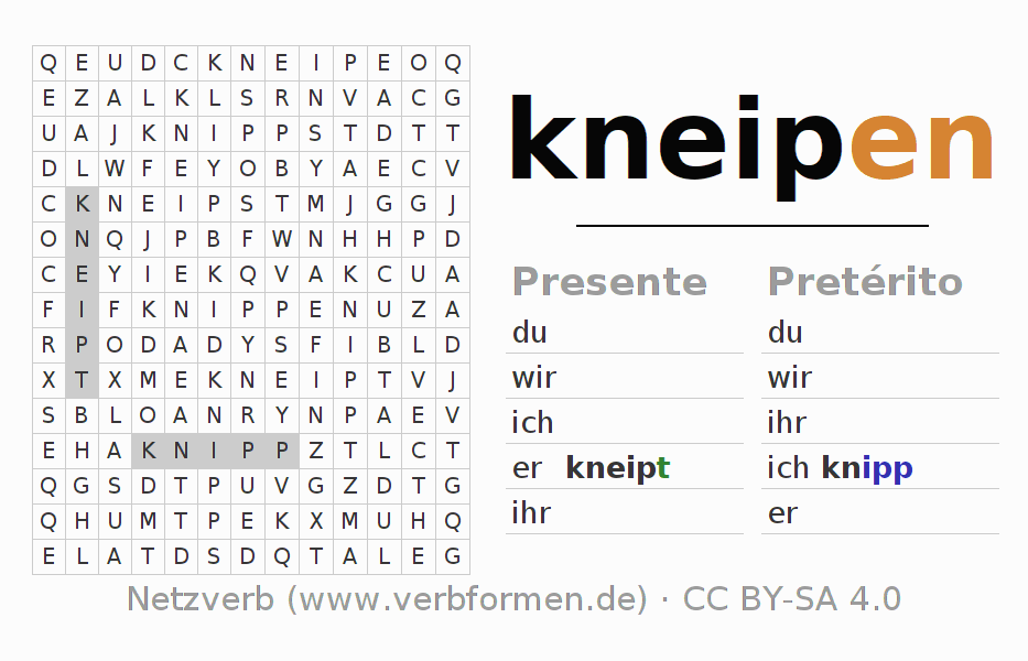 Con el juego de palabras cruzadas (Wortsuchrätsel o Suchsel) puedes aprender las conjugaciones alemanas. Tienes que armar cada una de las formas verbales para después encontrarlas dentro de una sopa de letras. También puedes proceder de forma contraria. Una vez que encuentras un verbo conjugado, tienes que descubrir a qué forma verbal pertenece. Para descargar e imprimir, puedes acceder por aquí a una versión en PDF-Versión o también como imagen. También hay muchas otras hojas de ejercicios para los verbos kneipen. Todo el material de estudio es Open Educational Resources (OER), es decir, libre de licencias CC BY-SA 4.0 y puede ser descargado y utilizado de forma gratuita. En este link en la sección de ayuda encuentras más información Poner en práctica las sopas de letras en el aula y el autoaprendizaje..