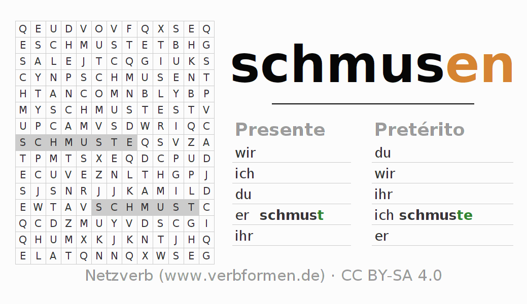 Guía: forma las construcciones correctas para el verbo schmusen y encuéntralas en el acertijo. O también encuentra la conjugación de schmusen en la sopa de letras y ordénala en la construcción verbal correcta. Las diéresis y el ß aparecen escritos como: ss (ß), oe (ö), ae (ä) y ue (ü).La solución se encuentra al final de la página.