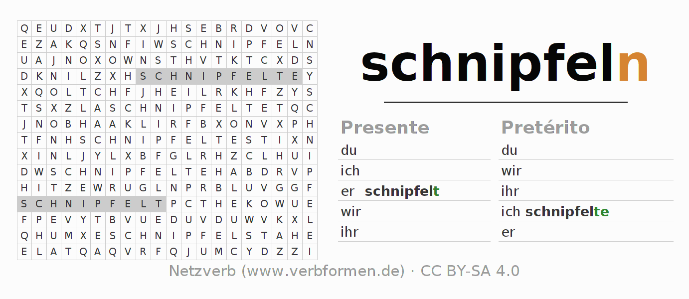 Con el juego de palabras cruzadas (Wortsuchrätsel o Suchsel) puedes aprender las conjugaciones alemanas. Tienes que armar cada una de las formas verbales para después encontrarlas dentro de una sopa de letras. También puedes proceder de forma contraria. Una vez que encuentras un verbo conjugado, tienes que descubrir a qué forma verbal pertenece. Para descargar e imprimir, puedes acceder por aquí a una versión en PDF-Versión o también como imagen. También hay muchas otras hojas de ejercicios para los verbos schnipfeln. Todo el material de estudio es Open Educational Resources (OER), es decir, libre de licencias CC BY-SA 4.0 y puede ser descargado y utilizado de forma gratuita. En este link en la sección de ayuda encuentras más información Poner en práctica las sopas de letras en el aula y el autoaprendizaje..