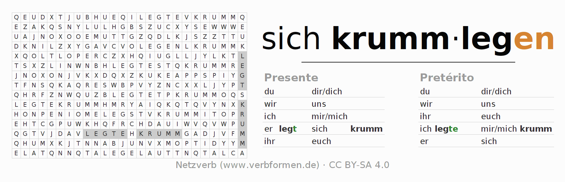 Guía: forma las construcciones correctas para el verbo sich krummlegen y encuéntralas en el acertijo. O también encuentra la conjugación de sich krummlegen en la sopa de letras y ordénala en la construcción verbal correcta. Las diéresis y el ß aparecen escritos como: ss (ß), oe (ö), ae (ä) y ue (ü).La solución se encuentra al final de la página.