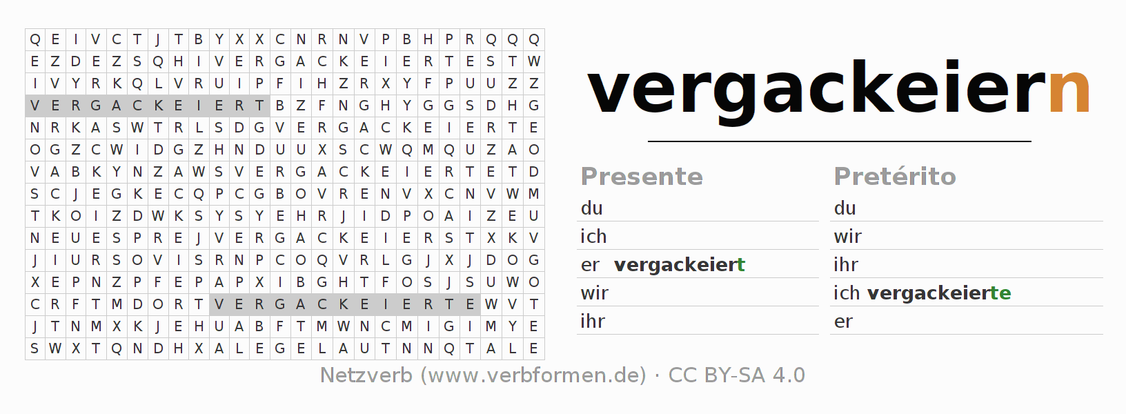 Guía: forma las construcciones correctas para el verbo vergackeiern y encuéntralas en el acertijo. O también encuentra la conjugación de vergackeiern en la sopa de letras y ordénala en la construcción verbal correcta. Las diéresis y el ß aparecen escritos como: ss (ß), oe (ö), ae (ä) y ue (ü).La solución se encuentra al final de la página.
