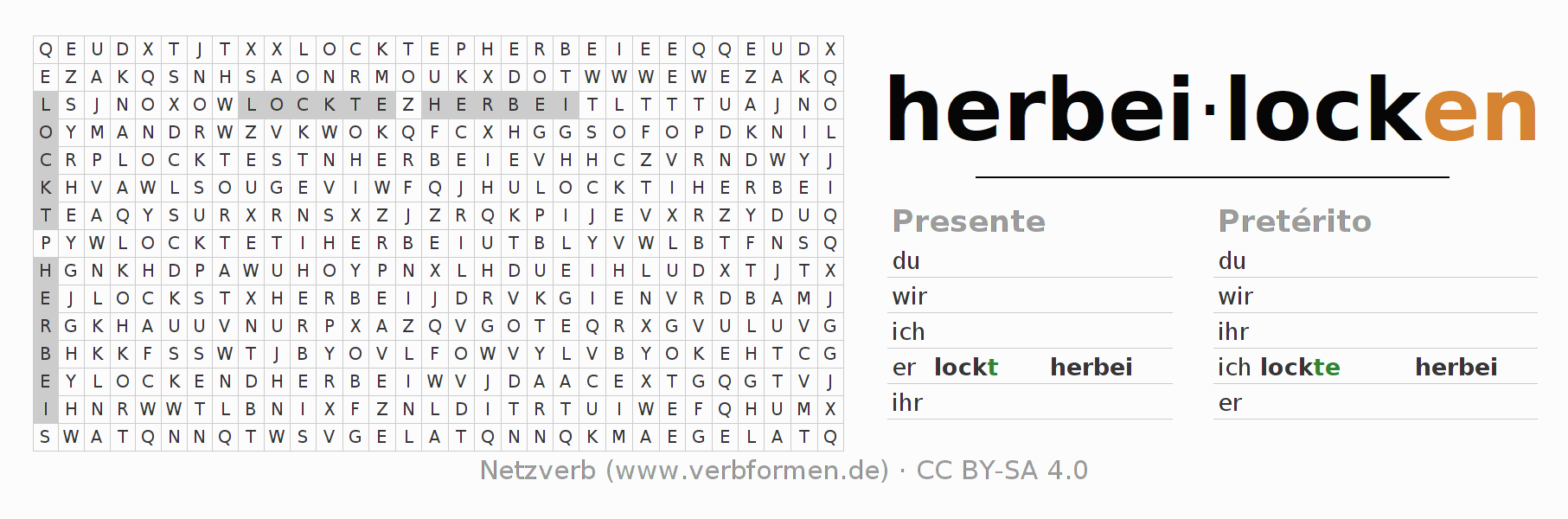 Guía: forma las construcciones correctas para el verbo herbeilocken y encuéntralas en el acertijo. O también encuentra la conjugación de herbeilocken en la sopa de letras y ordénala en la construcción verbal correcta. Las diéresis y el ß aparecen escritos como: ss (ß), oe (ö), ae (ä) y ue (ü).La solución se encuentra al final de la página.