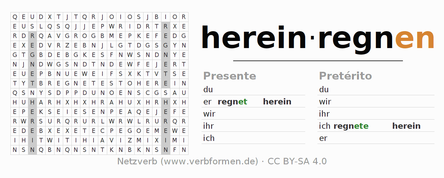 Guía: forma las construcciones correctas para el verbo hereinregnen y encuéntralas en el acertijo. O también encuentra la conjugación de hereinregnen en la sopa de letras y ordénala en la construcción verbal correcta. Las diéresis y el ß aparecen escritos como: ss (ß), oe (ö), ae (ä) y ue (ü).La solución se encuentra al final de la página.