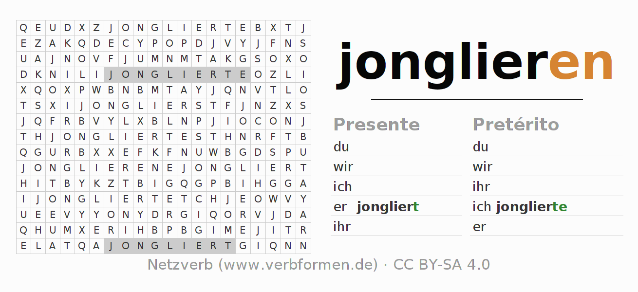 Guía: forma las construcciones correctas para el verbo jonglieren y encuéntralas en el acertijo. O también encuentra la conjugación de jonglieren en la sopa de letras y ordénala en la construcción verbal correcta. Las diéresis y el ß aparecen escritos como: ss (ß), oe (ö), ae (ä) y ue (ü).La solución se encuentra al final de la página.