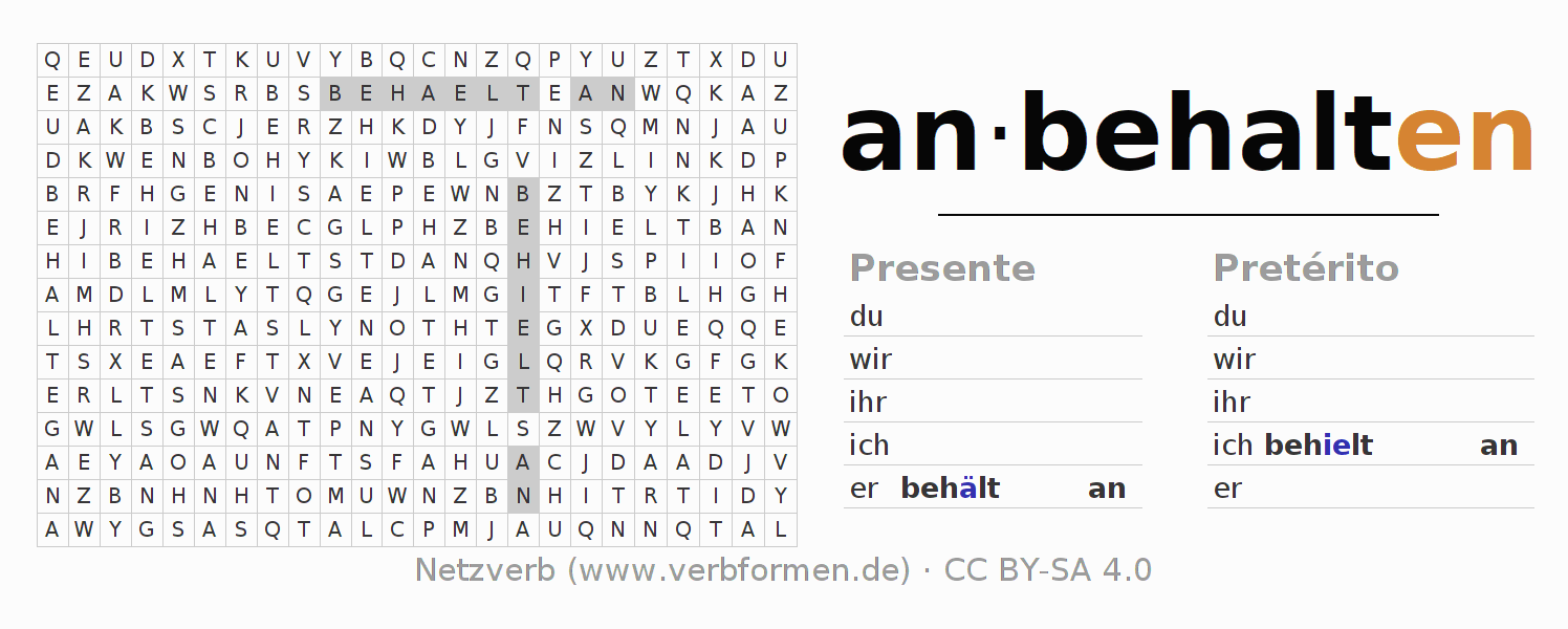 Guía: forma las construcciones correctas para el verbo anbehalten y encuéntralas en el acertijo. O también encuentra la conjugación de anbehalten en la sopa de letras y ordénala en la construcción verbal correcta. Las diéresis y el ß aparecen escritos como: ss (ß), oe (ö), ae (ä) y ue (ü).La solución se encuentra al final de la página.