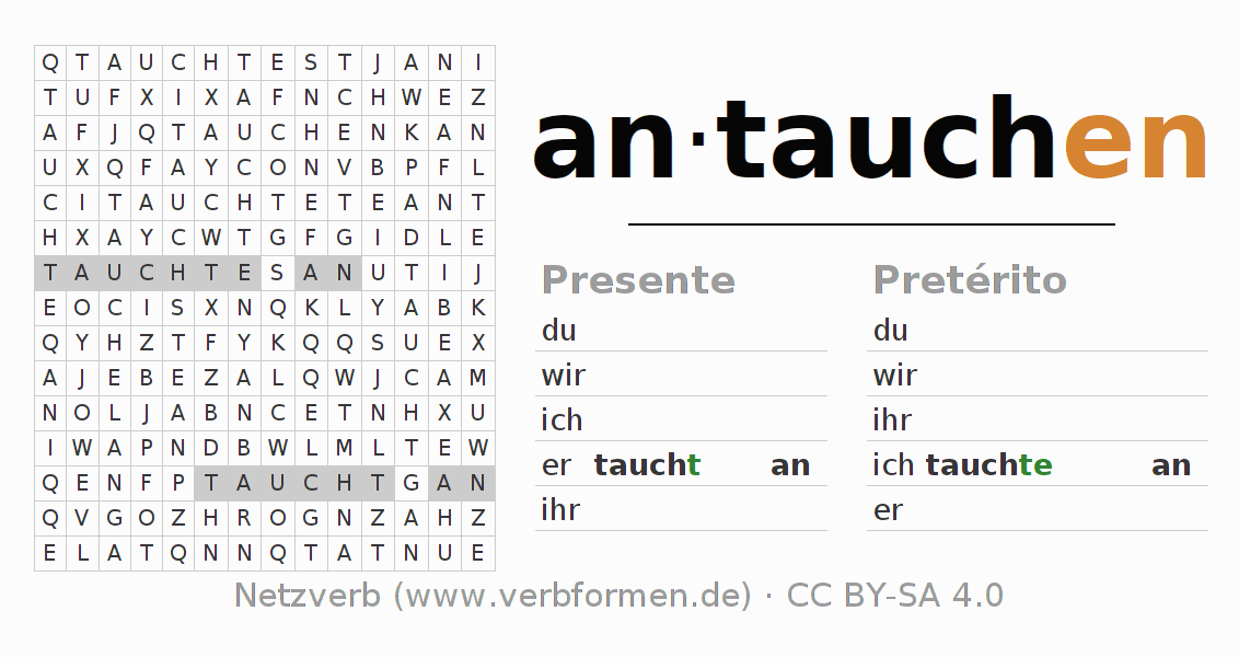 Con el juego de palabras cruzadas (Wortsuchrätsel o Suchsel) puedes aprender las conjugaciones alemanas. Tienes que armar cada una de las formas verbales para después encontrarlas dentro de una sopa de letras. También puedes proceder de forma contraria. Una vez que encuentras un verbo conjugado, tienes que descubrir a qué forma verbal pertenece. Para descargar e imprimir, puedes acceder por aquí a una versión en PDF-Versión o también como imagen. También hay muchas otras hojas de ejercicios para los verbos antauchen. Todo el material de estudio es Open Educational Resources (OER), es decir, libre de licencias CC BY-SA 4.0 y puede ser descargado y utilizado de forma gratuita. En este link en la sección de ayuda encuentras más información Poner en práctica las sopas de letras en el aula y el autoaprendizaje..