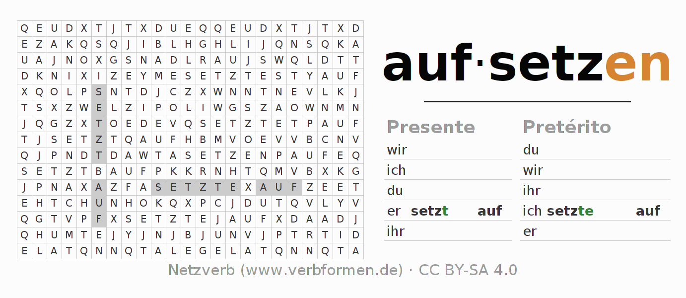 Con el juego de palabras cruzadas (Wortsuchrätsel o Suchsel) puedes aprender las conjugaciones alemanas. Tienes que armar cada una de las formas verbales para después encontrarlas dentro de una sopa de letras. También puedes proceder de forma contraria. Una vez que encuentras un verbo conjugado, tienes que descubrir a qué forma verbal pertenece. Para descargar e imprimir, puedes acceder por aquí a una versión en PDF-Versión o también como imagen. También hay muchas otras hojas de ejercicios para los verbos aufsetzen. Todo el material de estudio es Open Educational Resources (OER), es decir, libre de licencias CC BY-SA 4.0 y puede ser descargado y utilizado de forma gratuita. En este link en la sección de ayuda encuentras más información Poner en práctica las sopas de letras en el aula y el autoaprendizaje..