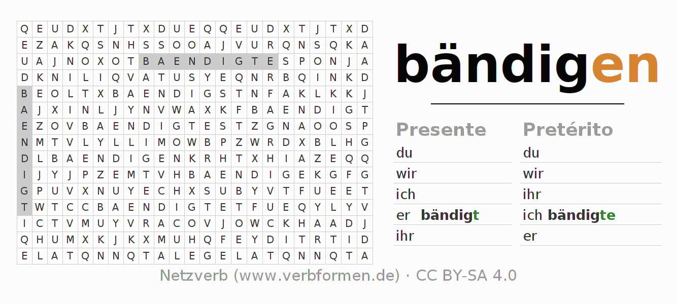 Guía: forma las construcciones correctas para el verbo bändigen y encuéntralas en el acertijo. O también encuentra la conjugación de bändigen en la sopa de letras y ordénala en la construcción verbal correcta. Las diéresis y el ß aparecen escritos como: ss (ß), oe (ö), ae (ä) y ue (ü).La solución se encuentra al final de la página.