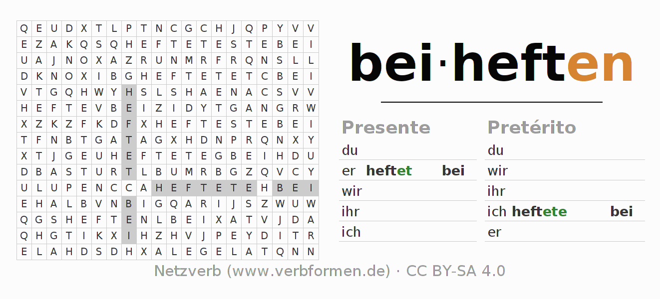 Guía: forma las construcciones correctas para el verbo beiheften y encuéntralas en el acertijo. O también encuentra la conjugación de beiheften en la sopa de letras y ordénala en la construcción verbal correcta. Las diéresis y el ß aparecen escritos como: ss (ß), oe (ö), ae (ä) y ue (ü).La solución se encuentra al final de la página.