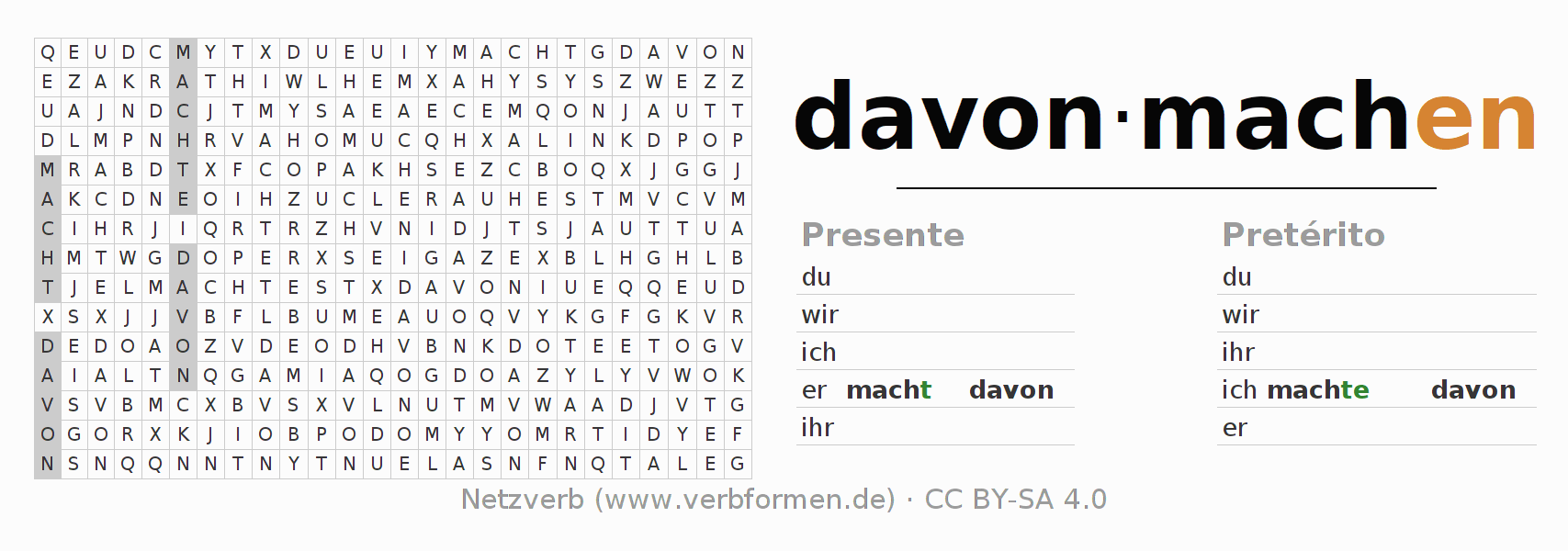 Con el juego de palabras cruzadas (Wortsuchrätsel o Suchsel) puedes aprender las conjugaciones alemanas. Tienes que armar cada una de las formas verbales para después encontrarlas dentro de una sopa de letras. También puedes proceder de forma contraria. Una vez que encuentras un verbo conjugado, tienes que descubrir a qué forma verbal pertenece. Para descargar e imprimir, puedes acceder por aquí a una versión en PDF-Versión o también como imagen. También hay muchas otras hojas de ejercicios para los verbos davonmachen. Todo el material de estudio es Open Educational Resources (OER), es decir, libre de licencias CC BY-SA 4.0 y puede ser descargado y utilizado de forma gratuita. En este link en la sección de ayuda encuentras más información Poner en práctica las sopas de letras en el aula y el autoaprendizaje..