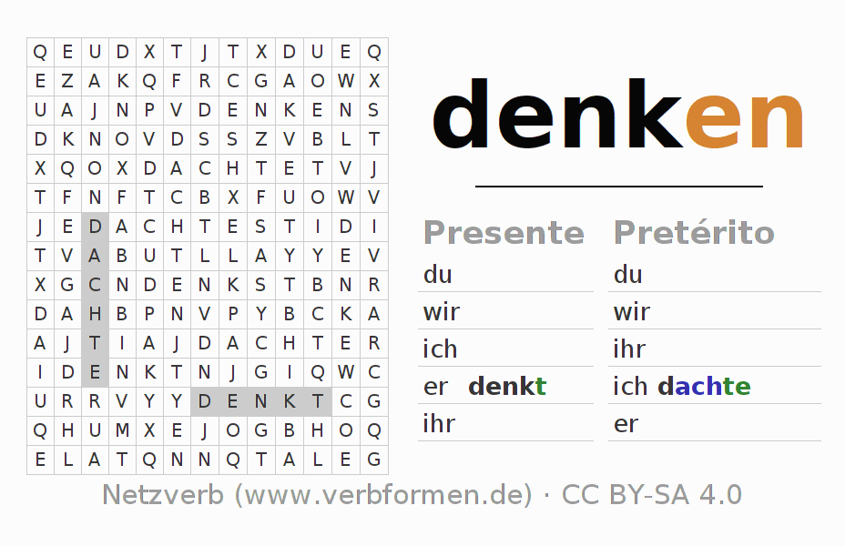 Con el juego de palabras cruzadas (Wortsuchrätsel o Suchsel) puedes aprender las conjugaciones alemanas. Tienes que armar cada una de las formas verbales para después encontrarlas dentro de una sopa de letras. También puedes proceder de forma contraria. Una vez que encuentras un verbo conjugado, tienes que descubrir a qué forma verbal pertenece. Para descargar e imprimir, puedes acceder por aquí a una versión en PDF-Versión o también como imagen. También hay muchas otras hojas de ejercicios para los verbos denken. Todo el material de estudio es Open Educational Resources (OER), es decir, libre de licencias CC BY-SA 4.0 y puede ser descargado y utilizado de forma gratuita. En este link en la sección de ayuda encuentras más información Poner en práctica las sopas de letras en el aula y el autoaprendizaje..