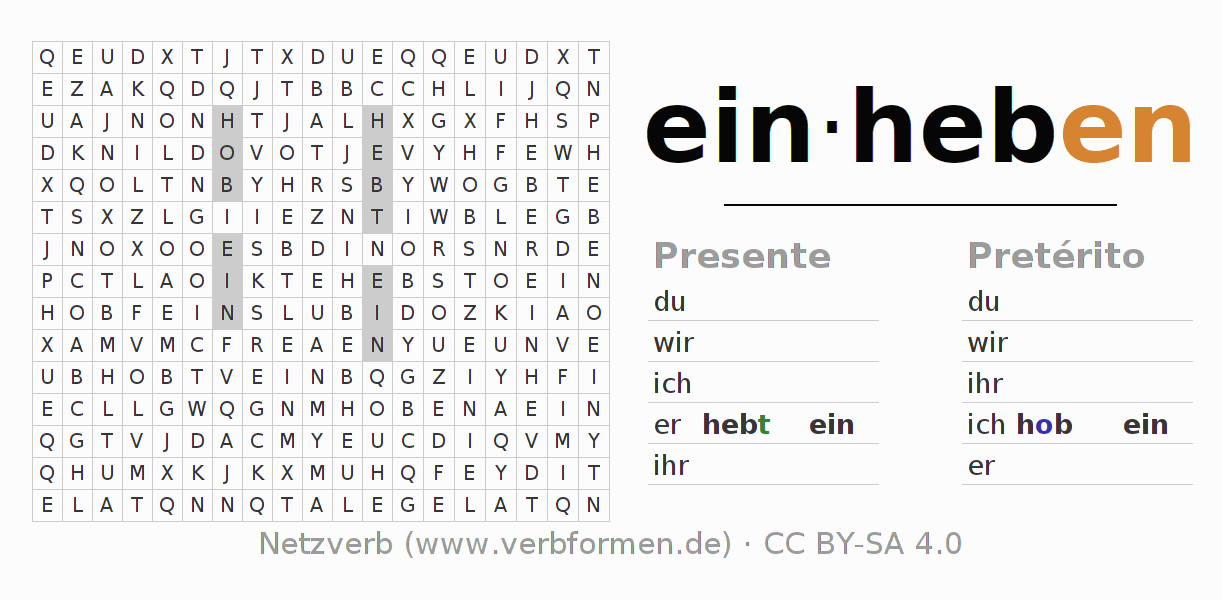 Guía: forma las construcciones correctas para el verbo einheben y encuéntralas en el acertijo. O también encuentra la conjugación de einheben en la sopa de letras y ordénala en la construcción verbal correcta. Las diéresis y el ß aparecen escritos como: ss (ß), oe (ö), ae (ä) y ue (ü).La solución se encuentra al final de la página.