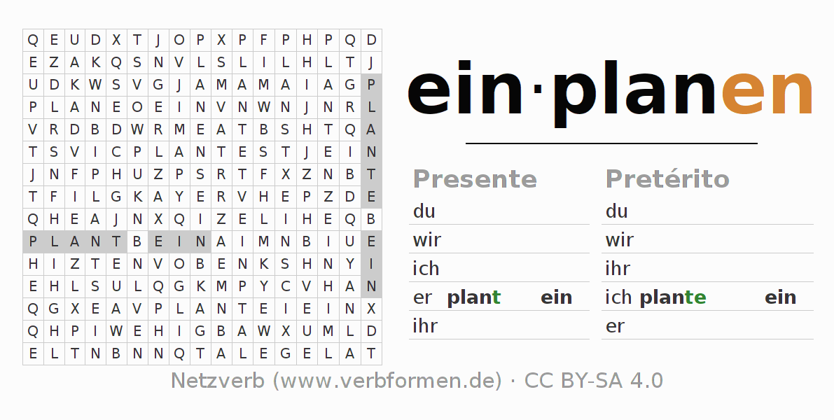 Con el juego de palabras cruzadas (Wortsuchrätsel o Suchsel) puedes aprender las conjugaciones alemanas. Tienes que armar cada una de las formas verbales para después encontrarlas dentro de una sopa de letras. También puedes proceder de forma contraria. Una vez que encuentras un verbo conjugado, tienes que descubrir a qué forma verbal pertenece. Para descargar e imprimir, puedes acceder por aquí a una versión en PDF-Versión o también como imagen. También hay muchas otras hojas de ejercicios para los verbos einplanen. Todo el material de estudio es Open Educational Resources (OER), es decir, libre de licencias CC BY-SA 4.0 y puede ser descargado y utilizado de forma gratuita. En este link en la sección de ayuda encuentras más información Poner en práctica las sopas de letras en el aula y el autoaprendizaje..