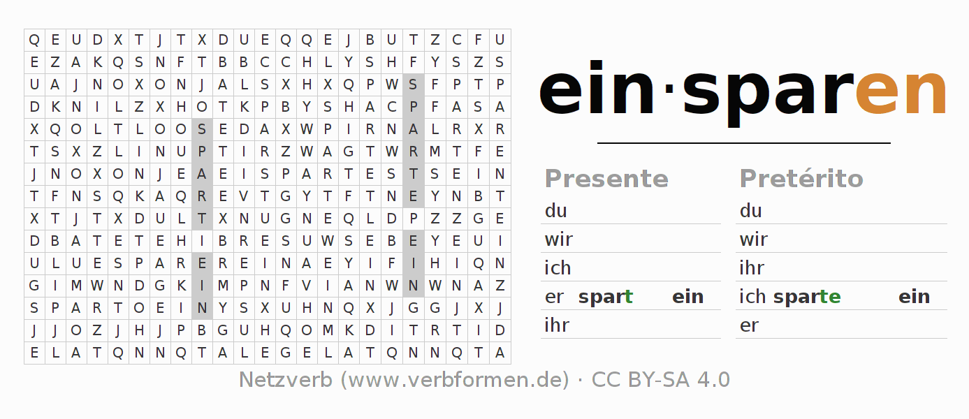 Guía: forma las construcciones correctas para el verbo einsparen y encuéntralas en el acertijo. O también encuentra la conjugación de einsparen en la sopa de letras y ordénala en la construcción verbal correcta. Las diéresis y el ß aparecen escritos como: ss (ß), oe (ö), ae (ä) y ue (ü).La solución se encuentra al final de la página.