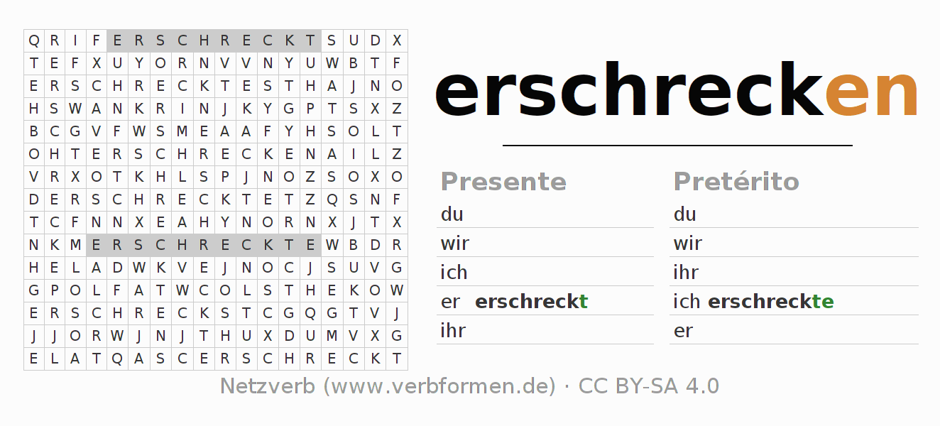 Con el juego de palabras cruzadas (Wortsuchrätsel o Suchsel) puedes aprender las conjugaciones alemanas. Tienes que armar cada una de las formas verbales para después encontrarlas dentro de una sopa de letras. También puedes proceder de forma contraria. Una vez que encuentras un verbo conjugado, tienes que descubrir a qué forma verbal pertenece. Para descargar e imprimir, puedes acceder por aquí a una versión en PDF-Versión o también como imagen. También hay muchas otras hojas de ejercicios para los verbos erschrecken. Todo el material de estudio es Open Educational Resources (OER), es decir, libre de licencias CC BY-SA 4.0 y puede ser descargado y utilizado de forma gratuita. En este link en la sección de ayuda encuentras más información Poner en práctica las sopas de letras en el aula y el autoaprendizaje..