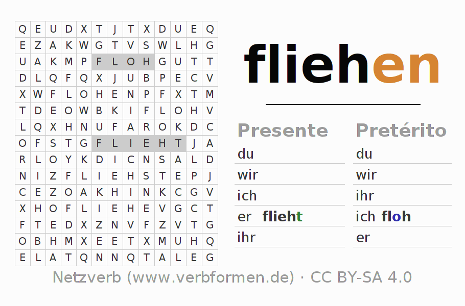 Con el juego de palabras cruzadas (Wortsuchrätsel o Suchsel) puedes aprender las conjugaciones alemanas. Tienes que armar cada una de las formas verbales para después encontrarlas dentro de una sopa de letras. También puedes proceder de forma contraria. Una vez que encuentras un verbo conjugado, tienes que descubrir a qué forma verbal pertenece. Para descargar e imprimir, puedes acceder por aquí a una versión en PDF-Versión o también como imagen. También hay muchas otras hojas de ejercicios para los verbos fliehen. Todo el material de estudio es Open Educational Resources (OER), es decir, libre de licencias CC BY-SA 4.0 y puede ser descargado y utilizado de forma gratuita. En este link en la sección de ayuda encuentras más información Poner en práctica las sopas de letras en el aula y el autoaprendizaje..