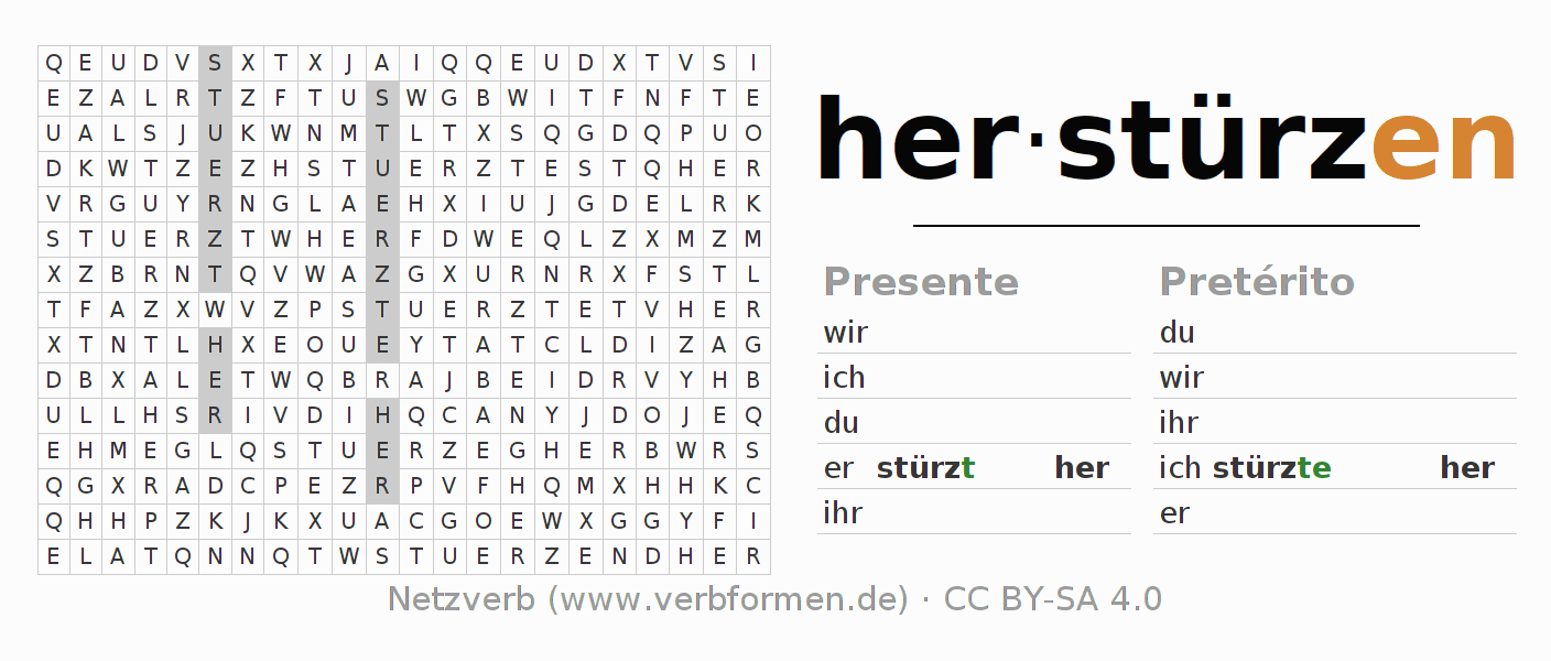 Guía: forma las construcciones correctas para el verbo herstürzen y encuéntralas en el acertijo. O también encuentra la conjugación de herstürzen en la sopa de letras y ordénala en la construcción verbal correcta. Las diéresis y el ß aparecen escritos como: ss (ß), oe (ö), ae (ä) y ue (ü).La solución se encuentra al final de la página.