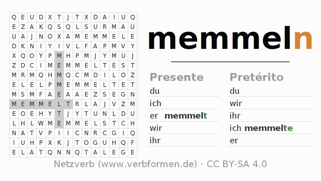 Guía: forma las construcciones correctas para el verbo memmeln y encuéntralas en el acertijo. O también encuentra la conjugación de memmeln en la sopa de letras y ordénala en la construcción verbal correcta. Las diéresis y el ß aparecen escritos como: ss (ß), oe (ö), ae (ä) y ue (ü).La solución se encuentra al final de la página.
