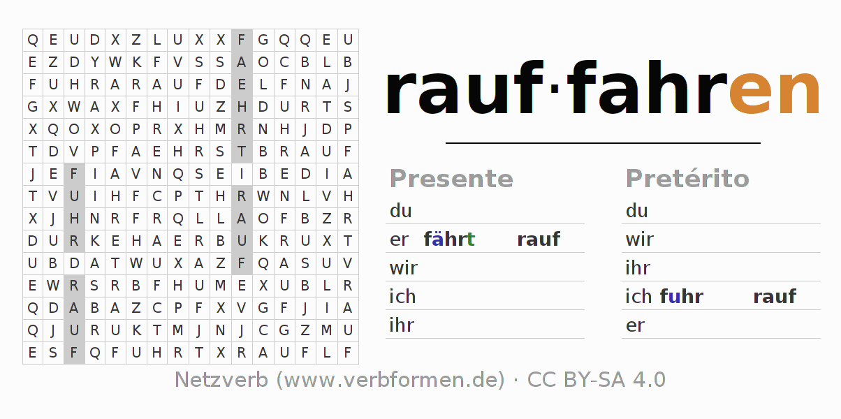 Guía: forma las construcciones correctas para el verbo rauffahren y encuéntralas en el acertijo. O también encuentra la conjugación de rauffahren en la sopa de letras y ordénala en la construcción verbal correcta. Las diéresis y el ß aparecen escritos como: ss (ß), oe (ö), ae (ä) y ue (ü).La solución se encuentra al final de la página.