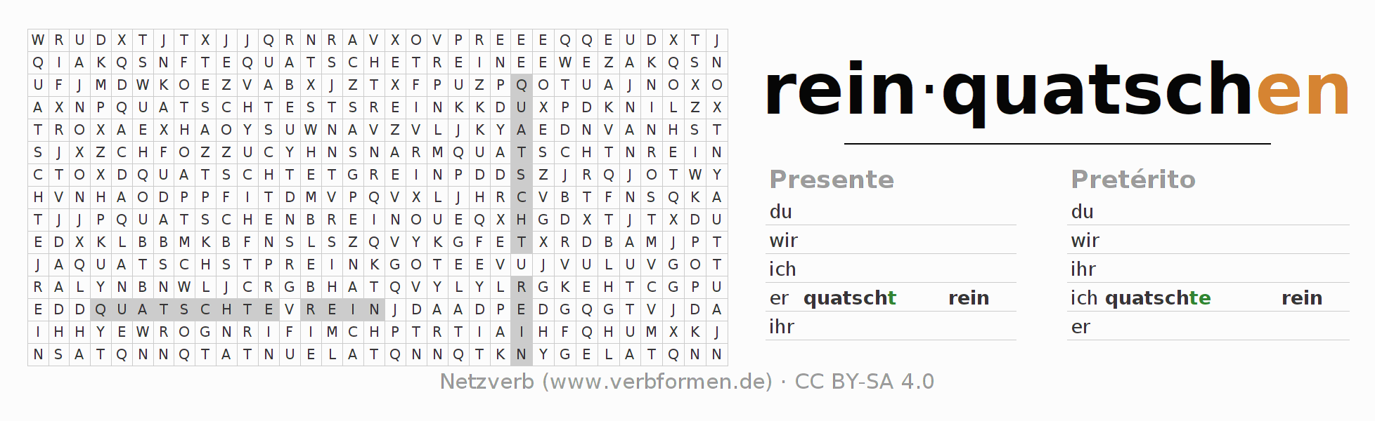 Guía: forma las construcciones correctas para el verbo reinquatschen y encuéntralas en el acertijo. O también encuentra la conjugación de reinquatschen en la sopa de letras y ordénala en la construcción verbal correcta. Las diéresis y el ß aparecen escritos como: ss (ß), oe (ö), ae (ä) y ue (ü).La solución se encuentra al final de la página.