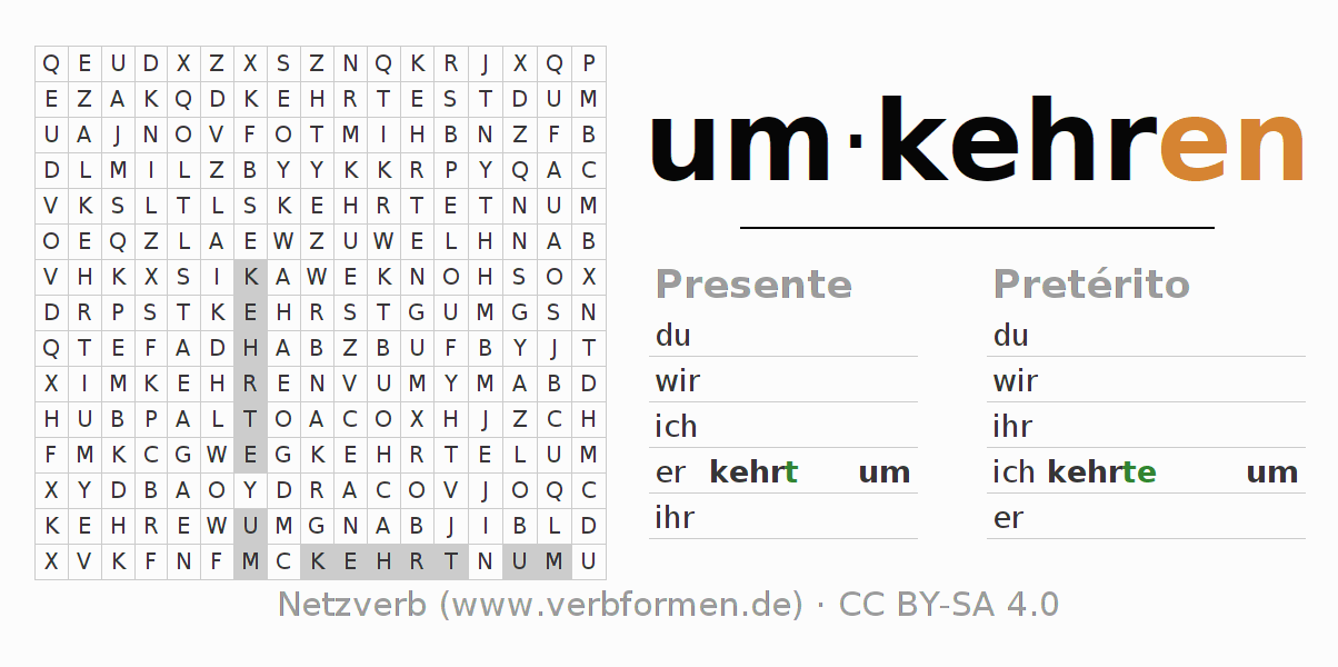 Guía: forma las construcciones correctas para el verbo umkehren y encuéntralas en el acertijo. O también encuentra la conjugación de umkehren en la sopa de letras y ordénala en la construcción verbal correcta. Las diéresis y el ß aparecen escritos como: ss (ß), oe (ö), ae (ä) y ue (ü).La solución se encuentra al final de la página.