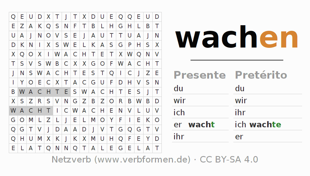 Guía: forma las construcciones correctas para el verbo wachen y encuéntralas en el acertijo. O también encuentra la conjugación de wachen en la sopa de letras y ordénala en la construcción verbal correcta. Las diéresis y el ß aparecen escritos como: ss (ß), oe (ö), ae (ä) y ue (ü).La solución se encuentra al final de la página.