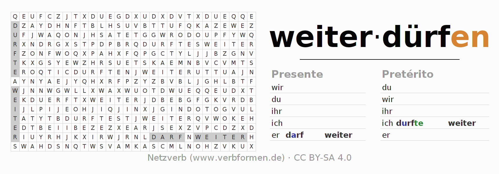 Con el juego de palabras cruzadas (Wortsuchrätsel o Suchsel) puedes aprender las conjugaciones alemanas. Tienes que armar cada una de las formas verbales para después encontrarlas dentro de una sopa de letras. También puedes proceder de forma contraria. Una vez que encuentras un verbo conjugado, tienes que descubrir a qué forma verbal pertenece. Para descargar e imprimir, puedes acceder por aquí a una versión en PDF-Versión o también como imagen. También hay muchas otras hojas de ejercicios para los verbos weiterdürfen. Todo el material de estudio es Open Educational Resources (OER), es decir, libre de licencias CC BY-SA 4.0 y puede ser descargado y utilizado de forma gratuita. En este link en la sección de ayuda encuentras más información Poner en práctica las sopas de letras en el aula y el autoaprendizaje..