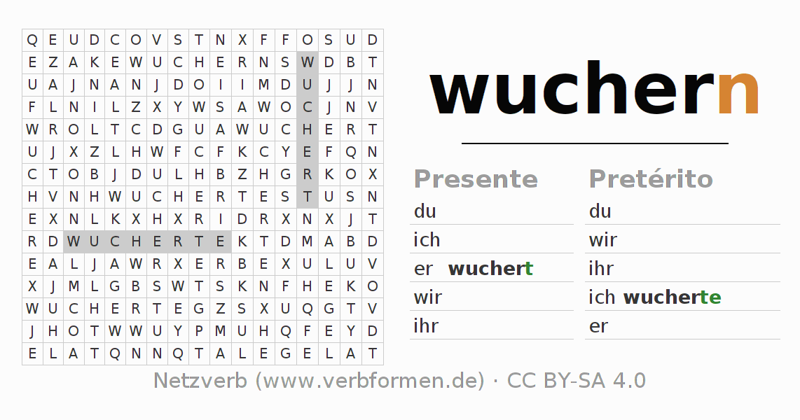 Guía: forma las construcciones correctas para el verbo wuchern y encuéntralas en el acertijo. O también encuentra la conjugación de wuchern en la sopa de letras y ordénala en la construcción verbal correcta. Las diéresis y el ß aparecen escritos como: ss (ß), oe (ö), ae (ä) y ue (ü).La solución se encuentra al final de la página.