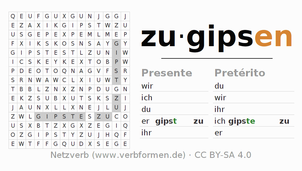 Guía: forma las construcciones correctas para el verbo zugipsen y encuéntralas en el acertijo. O también encuentra la conjugación de zugipsen en la sopa de letras y ordénala en la construcción verbal correcta. Las diéresis y el ß aparecen escritos como: ss (ß), oe (ö), ae (ä) y ue (ü).La solución se encuentra al final de la página.