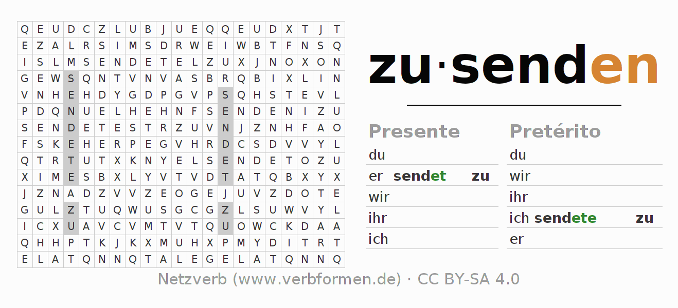 Guía: forma las construcciones correctas para el verbo zusenden y encuéntralas en el acertijo. O también encuentra la conjugación de zusenden en la sopa de letras y ordénala en la construcción verbal correcta. Las diéresis y el ß aparecen escritos como: ss (ß), oe (ö), ae (ä) y ue (ü).La solución se encuentra al final de la página.