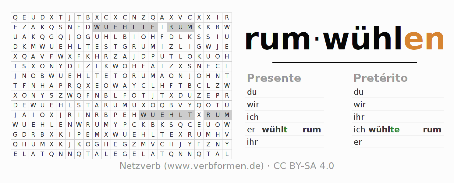 Juego de palabras cruzadas para conjugar el verbo alemán rumwühlen.