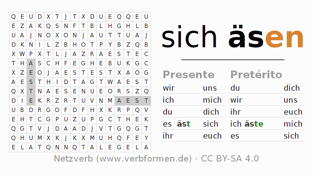 Guía: forma las construcciones correctas para el verbo sich äsen y encuéntralas en el acertijo. O también encuentra la conjugación de sich äsen en la sopa de letras y ordénala en la construcción verbal correcta. Las diéresis y el ß aparecen escritos como: ss (ß), oe (ö), ae (ä) y ue (ü).La solución se encuentra al final de la página.