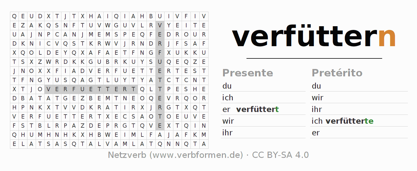 Guía: forma las construcciones correctas para el verbo verfüttern y encuéntralas en el acertijo. O también encuentra la conjugación de verfüttern en la sopa de letras y ordénala en la construcción verbal correcta. Las diéresis y el ß aparecen escritos como: ss (ß), oe (ö), ae (ä) y ue (ü).La solución se encuentra al final de la página.