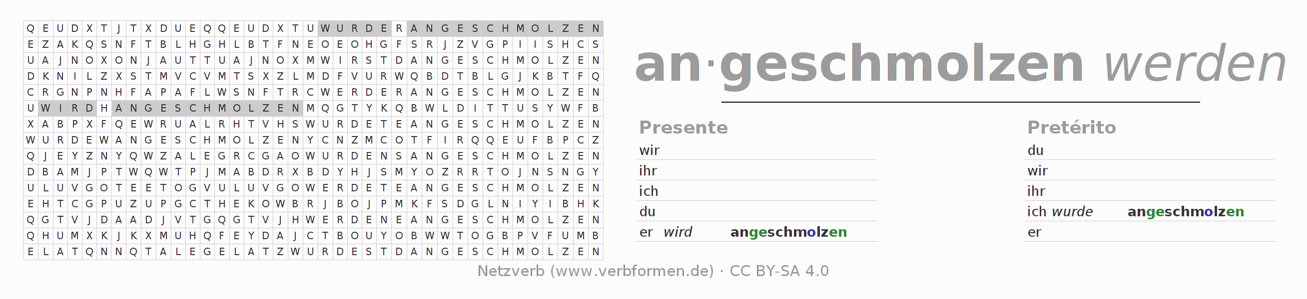 Con el juego de palabras cruzadas (Wortsuchrätsel o Suchsel) puedes aprender las conjugaciones alemanas. Tienes que armar cada una de las formas verbales para después encontrarlas dentro de una sopa de letras. También puedes proceder de forma contraria. Una vez que encuentras un verbo conjugado, tienes que descubrir a qué forma verbal pertenece. Para descargar e imprimir, puedes acceder por aquí a una versión en PDF-Versión o también como imagen. También hay muchas otras hojas de ejercicios para los verbos anschmelzen. Todo el material de estudio es Open Educational Resources (OER), es decir, libre de licencias CC BY-SA 4.0 y puede ser descargado y utilizado de forma gratuita. En este link en la sección de ayuda encuentras más información Poner en práctica las sopas de letras en el aula y el autoaprendizaje..
