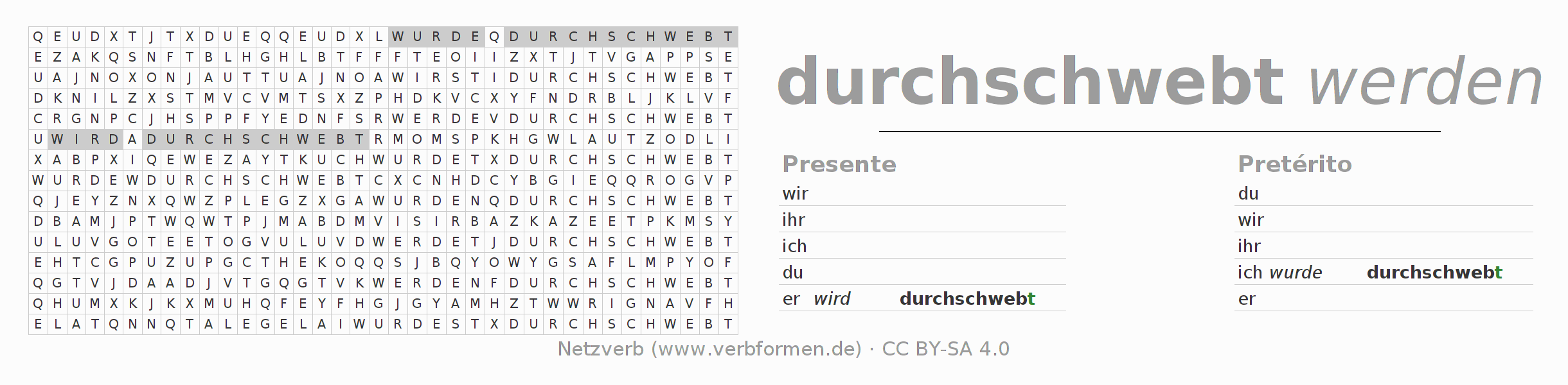 Guía: forma las construcciones correctas para el verbo durchschweben y encuéntralas en el acertijo. O también encuentra la conjugación de durchschweben en la sopa de letras y ordénala en la construcción verbal correcta. Las diéresis y el ß aparecen escritos como: ss (ß), oe (ö), ae (ä) y ue (ü).La solución se encuentra al final de la página.