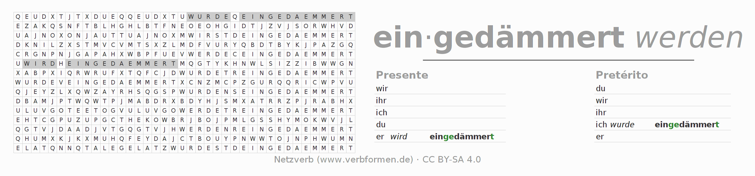 Guía: forma las construcciones correctas para el verbo eindämmern y encuéntralas en el acertijo. O también encuentra la conjugación de eindämmern en la sopa de letras y ordénala en la construcción verbal correcta. Las diéresis y el ß aparecen escritos como: ss (ß), oe (ö), ae (ä) y ue (ü).La solución se encuentra al final de la página.
